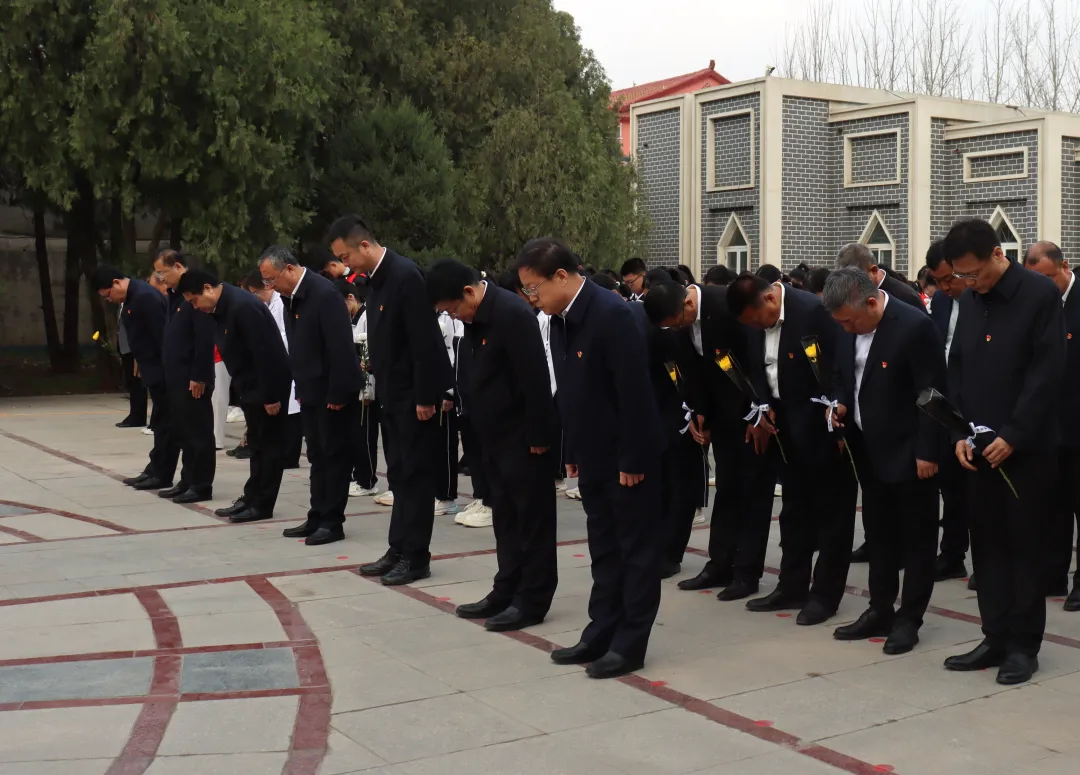 马本斋母子烈士陵园内庄严肃穆,全体人员列队于纪念碑北侧广场,肃立致敬。祭扫活动在庄重氛围中拉开帷幕,全体人员向英烈默哀1分钟,行三鞠躬礼,寄托无限哀思与崇高敬仰。县委书记吕荣锋缓步上前,细心整理缎带,表达对马本斋母子英烈的深切缅怀。