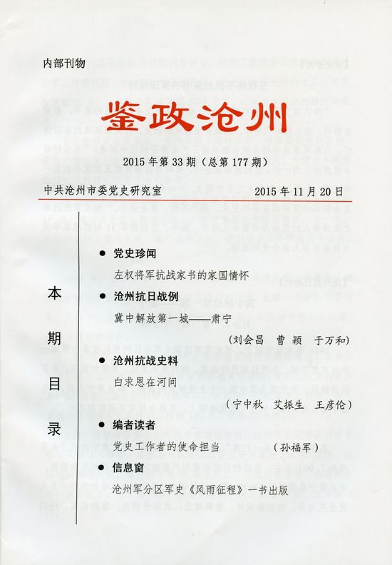 此前,我看到沧州市委党史研究室主办的《鉴政沧州》内刊(月三期),从2011年创刊,每期内容都是各个时期沧州党史的回顾,撰稿人都是沧州的老领导、老同志和党史工作者。党史研究室每年都把刊发的稿件编印成书,现已出版了四卷本。今年适逢中国人民抗日战争和世界反法西斯战争胜利70周年,党史研究室在《鉴政沧州》刊物上开辟了专栏,并及时出版了《沧州抗日英模》一书,对沧州在抗日战争中英雄人物、抗日根据地建设、主要战事以及发生在沧州大地上的惨案等汇集成册,再现了当年沧州人民同仇敌忾、奋勇抗战的战争奇观。正是党史工作者的使命担当与历史责任感,使他们竭尽全力地为党的事业讴歌呐喊,传承光大。