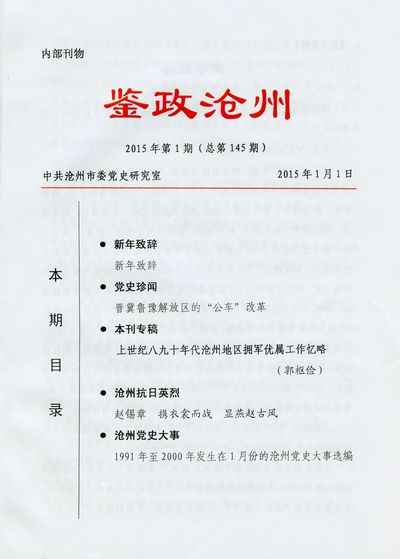 “客岁腊容随日换,新年春色逐风来。”身临这个大背景,《鉴政沧州》在沧州市委、市政府的关怀与指导下,一如既往地秉承“以史鉴今,资政育人”与“深刻了解过去、全面把握现在、正确创造未来”的主旨,特别以习近平同志在参观《复兴之路》陈列馆时指出的“实现中华民族伟大复兴,就是中华民族近代以来最伟大的梦想”的战略宏图为目标,努力追寻党的历史足迹、讴歌党的历史成就、总结党的历史经验、传承党的历史传统,精心组织抢救挖掘、整理编发了一批立足于沧州党政建设与经济社会发展的翔实资料,发挥了应有的积极作用,受到了国家和省党史部门的肯定与好评,也赢得了各级党政机关领导与社会各界人士的广泛赞誉。