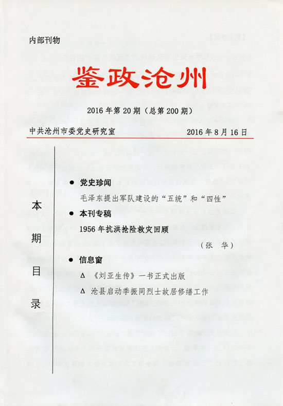 1955年1月到l957年4月底,我在献县先后任县委书记、县委第一书记。l956年8月初我正在东村乡下乡搞调查研究,接到紧急电话通知:要我马上动身回臧桥献县防汛指挥部指挥防汛战斗。当时献县连日降大雨,道路都是乡村土路,泥泞难走,自行车在沙土地上能骑,白土地上推着,黑土地上只能扛着。韩村区境内有一条河,叫白龙江,河水已满槽,河上没有桥,又必须从此过河,我就把衣服脱下来,绑在自行车架上,骑着自行车过河,还算万幸,踮着脚、闭着嘴、憋着气,眼睛看着方向,艰难地渡过了白龙江河。这一天,是8月3日,从上午8时左右出发,骑自行车,推自行车,扛自行车,走了大约70华里,下午l点左右赶到了驻在臧桥的县防汛指挥部。