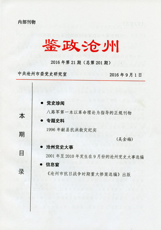 《沧州市抗日战争时期重大惨案选编》出版 为纪念中国人民抗日战争暨世界反法西斯战争胜利71周年,缅怀死难同胞,铭记历史,珍爱和平,我室经过一年多努力精心编著的《沧州市抗日战争时期重大惨案选编》一书,日前由河北人民出版社正式出版发行,是研究抗日战争史不可或缺的重要史料。