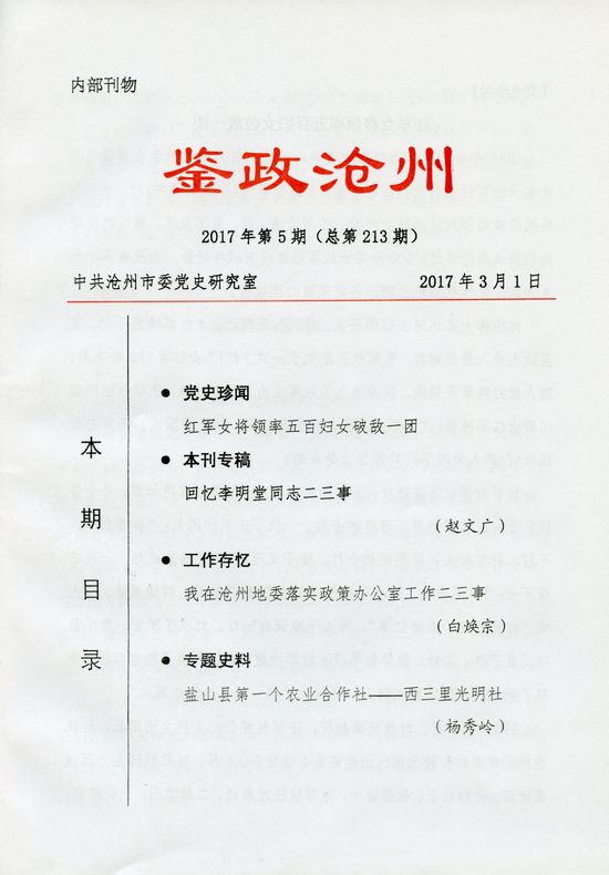 西三里光明农业合作社是1952年秋天成立的 (后改为祁玉堂农业合作社) ,是盐山县成立最早、远近闻名的农业合作社。