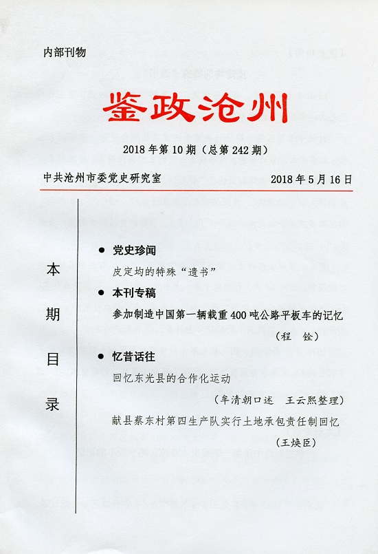 我叫牟清朝,今年90岁,在东光县人大科长岗位上离休。我刚参加工作是在教育系统,后被调县委农村工作部工作。当时农村工作部干部队伍很精干,由5人组成,部长李连奎,副部长李耀林,3个干事:张宗霞、王仕平和我。工作忙不过来时就从其他部门抽调部分同志协助。县委农村工作部职责范围很广,所有涉及农村的工作都管。县委领导也非常重视,几乎每周都要听取农村工作汇报,部署和检查农村工作。这期间,我参与了我县合作化过程,东光全县合作化情况可以说比较熟悉。