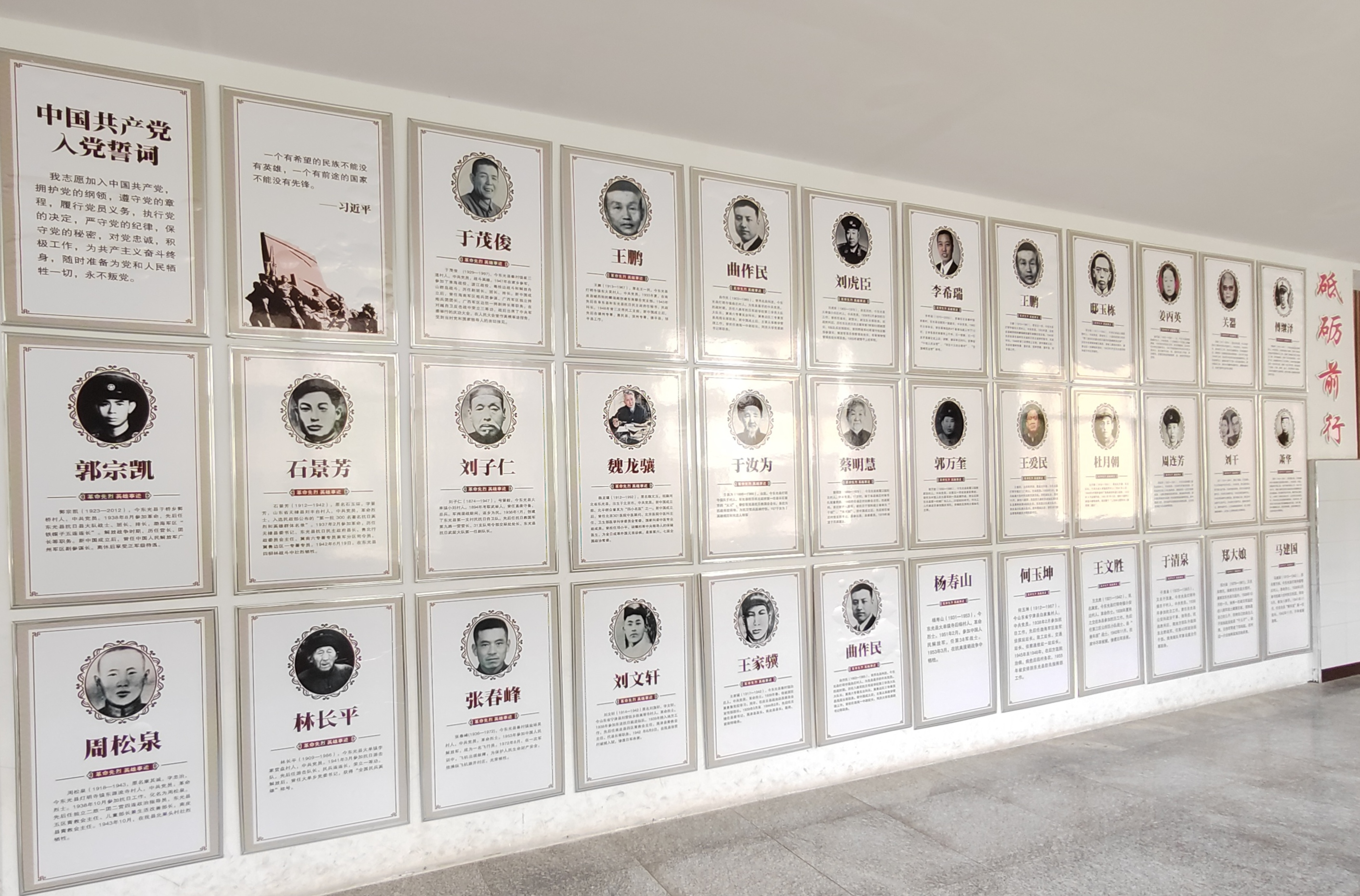 党史文化墙选取了在东光县抗日战争、解放战争、抗美援朝战争中牺牲的部分革命先烈的英勇事迹,制作成了人物事迹展牌在学校展出。该文化墙展示了革命先烈坚守初心,牢记使命,不怕牺牲,为党奉献的精神。教育引导学生了解革命历史,强化价值认同,激发爱党、爱国、爱家乡的热情,缅怀先烈,继承先烈遗志,以大无畏的英雄气概奋进新时代,开启新征程。