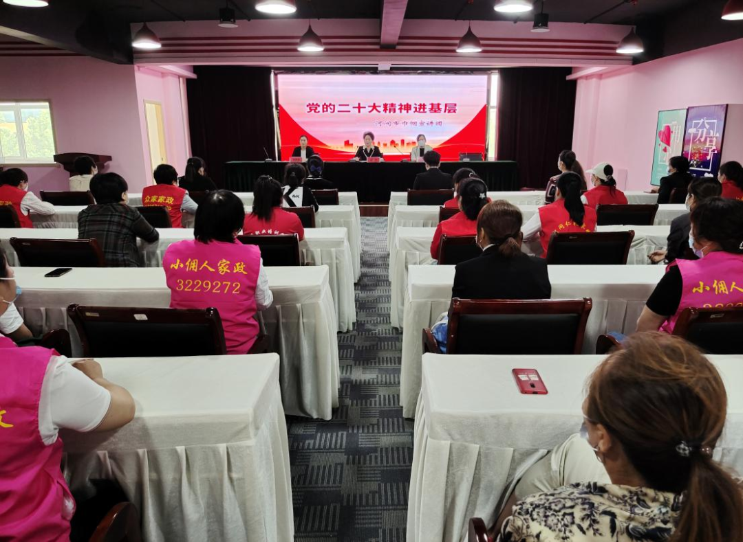 市委党史研究室和巾帼宣讲团走进家政行业,开展党的二十大精神宣讲,用通俗的语言、生动的故事、鲜活的案例深入解读党的二十大精神,让妇女群众听得懂、能领会、可落实。同时,大力弘扬爱国爱家、相亲相爱、向上向善、共建共享的社会主义家庭文明新风尚,引导广大妇女建功新时代、奋进新征程。
