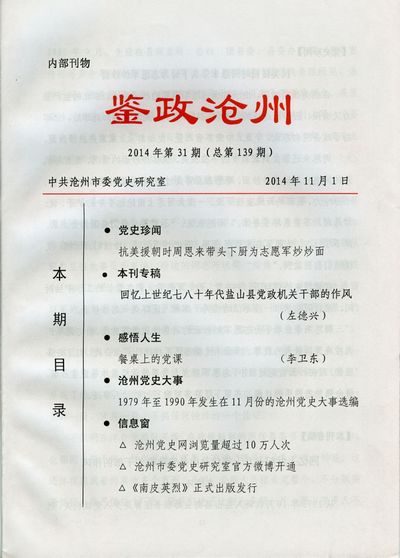 △《南皮英烈》正式出版发行 南皮县志办公室从2013年4月份起,即着手挖掘整理南皮县革命军人、革命烈士史料的搜集、遴选和梳理;9月份正式启动编纂工作;2014年7月完成初稿撰写,9月份交付印刷,10月份由中国文史出版社正式出版发行。
