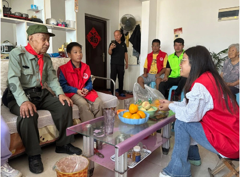 在烈士家属高义家中,老人家向大家展示了自己撰写的战争年代回忆录,并讲述了亲身经历的战斗往事。高义父辈四人都是为国捐躯的烈士,其本人也是抗美援朝的老战士,参加过著名的金城战役。小志愿者给高义老人佩戴红领巾并郑重敬礼,昭示着红色精神薪火相传、红色江山后继有人。