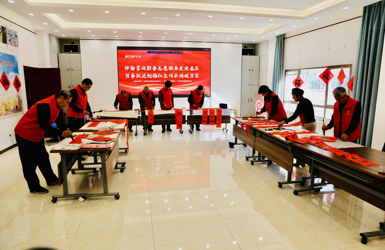 活动现场,来自老区促进会的资深党员为大家深入剖析了中华传统春联文化与形式,不仅展示了“古代书家集字”“名家楹联”“红色精神楹联”等优秀作品,还通过创新解读,赋予传统春联以思想内涵和时代价值。随后,红纸铺展,墨香四溢,书法志愿者们满怀激情,挥毫泼墨,创作出一幅幅精美的春联作品。这些作品不仅传递着浓浓的文化韵味和祝福,更承载着强大的精神力量和红色基因。在他们的创作中,传统与时代交融,文化与祝福相伴,共同为在场的人们带来了别具一格的艺术享受和文化启迪。