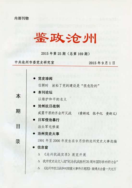 Δ《沧州抗战实录》展览开展 8月14日,《沧州抗战实录》展览在市博物馆开幕,40个展板,250余幅图片、1000余件展品,讲述了沧州大地上70年前艰苦卓绝的抗战史诗。市领导何志伟、辛书华、李丽华、何香久,沧州军分区政治部主任罗新生出席开幕式。