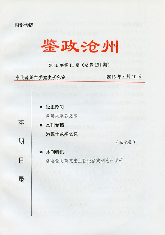 为筹备召开全省党史工作会议,配合中央党史研究室对基层党史工作的专题调研活动,2016年3月24日至25日,省委党史研究室主任张福建一行到沧州进行调研。沧州市委常委、秘书长宋有洪陪同调研。省委党史研究室副主任宋学民、沧州市委党史研究室主任刘德峰参加调研。